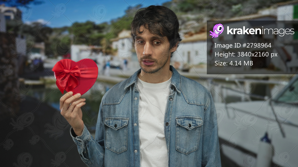 Man in denim jacket holds red heart gift box in right hand and tilts head by port building; uncertainty doubt.