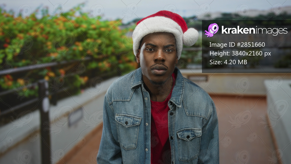 Man in denim jacket and red shirt wearing santa hat looks at camera with building behind him; holiday serenity.