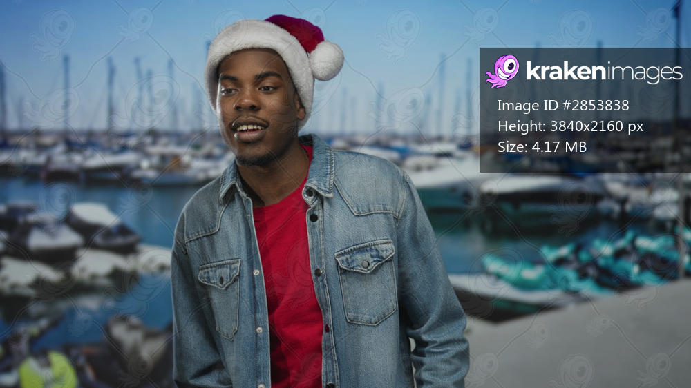 Man in denim jacket and red shirt wears santa hat standing at sunlit port lined with boats and yachts; holiday joy.