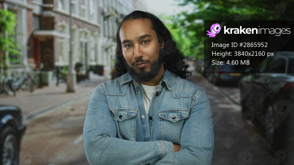 Man in denim jacket standing with arms crossed and smiling on a leafy city street lined with parked cars; confidence ease.