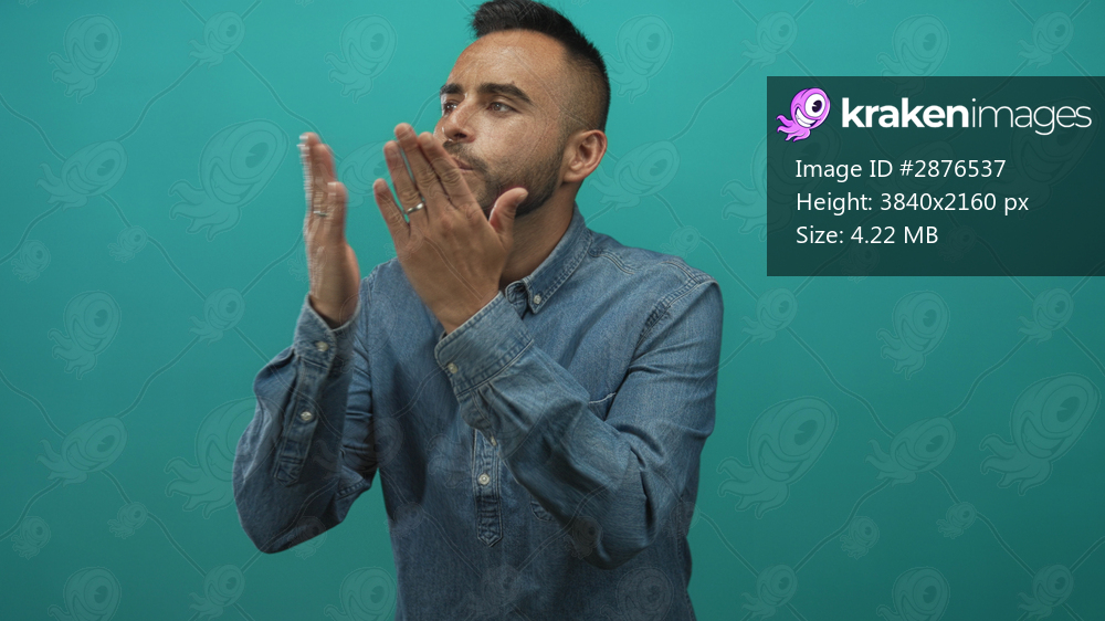 Man in denim shirt blowing kiss with hands near lips and rings visible in teal studio set; affection greeting.