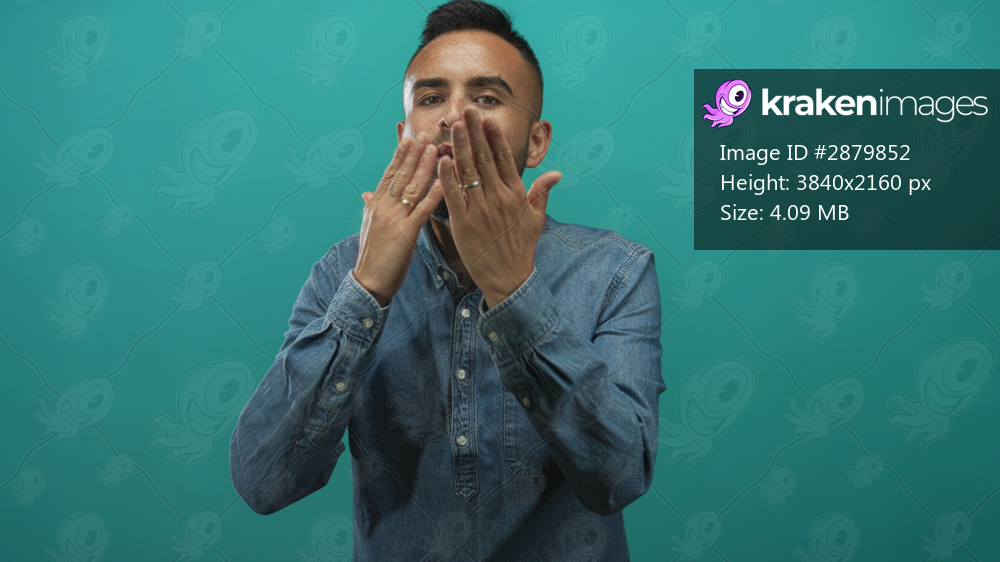 Man in denim shirt blowing kiss with hands near lips and rings visible in teal studio set; affection greeting.