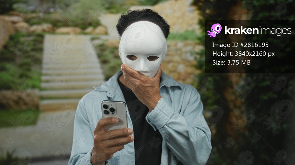 Man in denim shirt holds white mask to face on narrow old town street with smartphone in other hand; anonymity.
