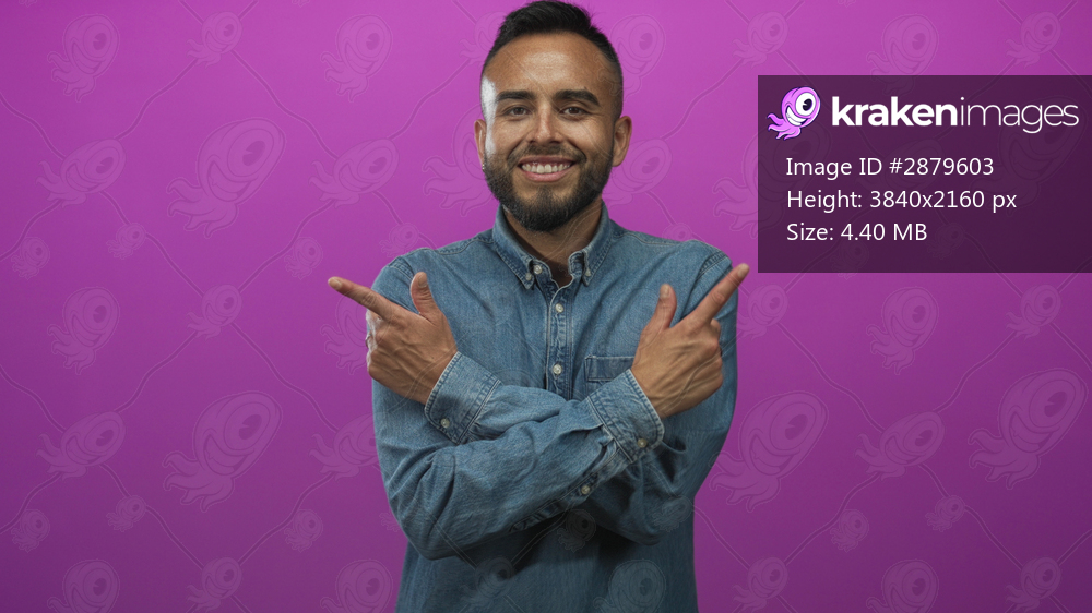 Man in denim shirt points both fingers with crossed arms toward sides in studio against a purple backdrop, smiling and engaged; playful confidence.