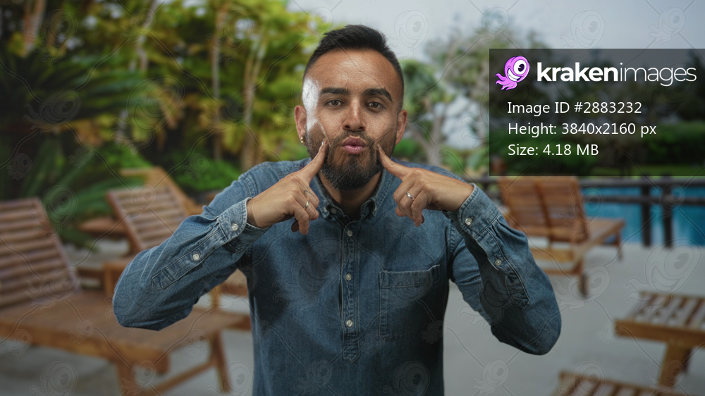 Man in denim shirt pressing cheeks with index fingers beside pool at resort building with lounge chairs and palm trees; playful mischief.