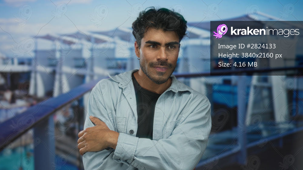 Man in faded denim shirt holds arm across chest on sunlit cruise boat deck at seaside port; serenity.