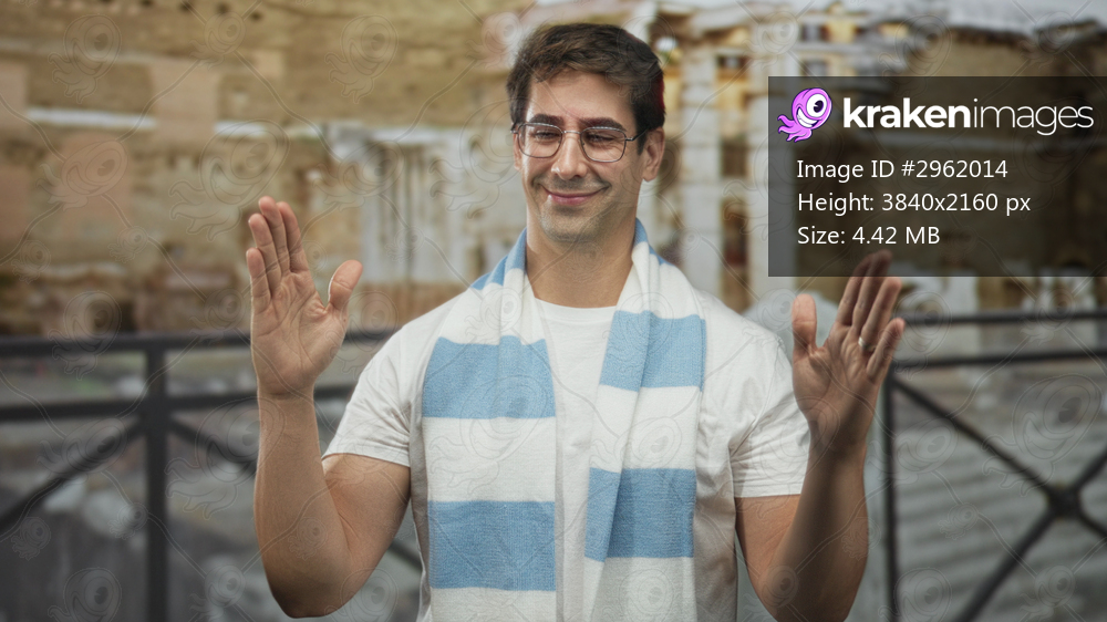 Man in fan scarf holds thumb and index fingers close in front of building; skepticism measurement scale.