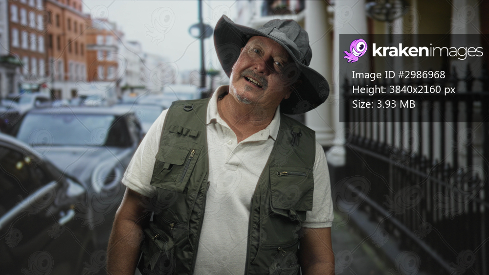 Man in fisherman vest tilting head and smiling while wearing wide brim hat on a city street; contentment retirement outdoors.