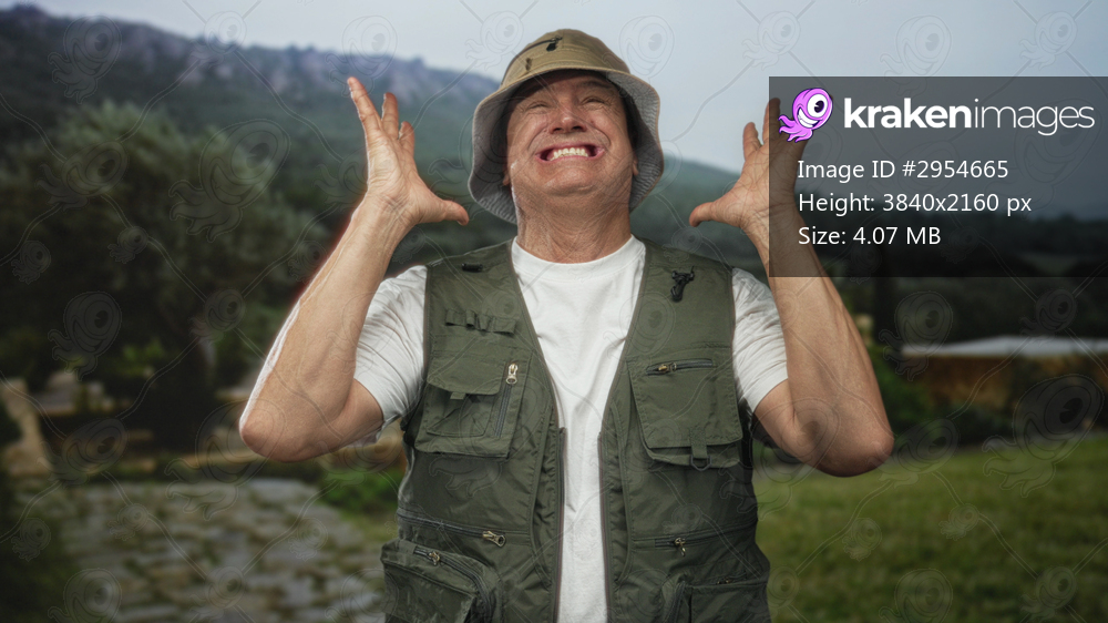 Man in fishing vest and bucket hat holds hands up, bare forearm visible and face grimacing beside stone path in forest; frustration.