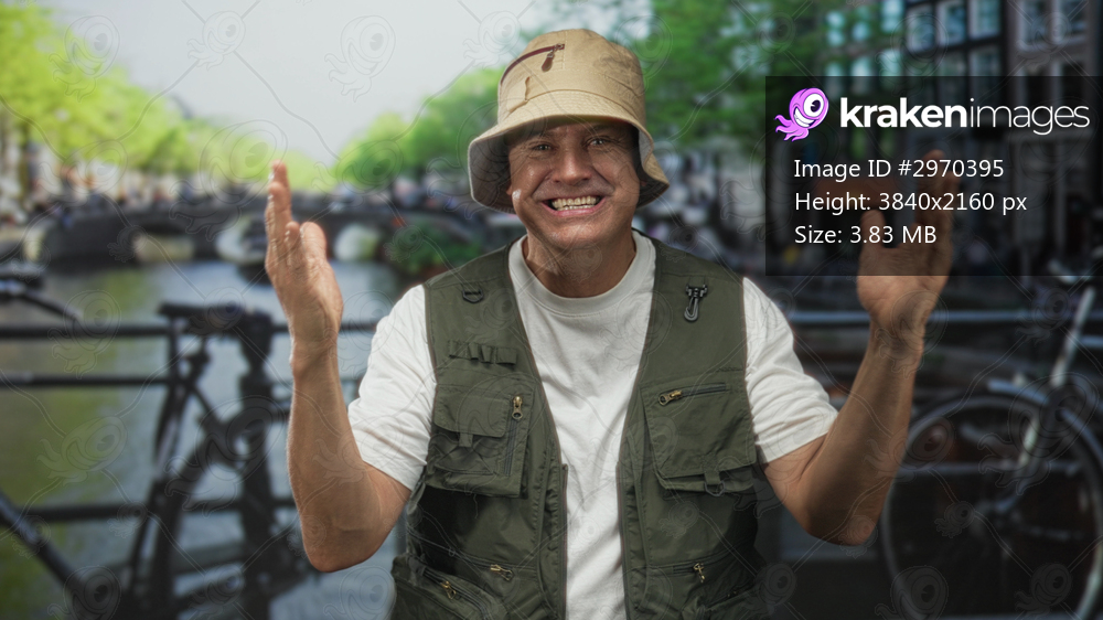 Man in fishing vest and bucket hat smiling with hands raised on canal bridge beside bicycles and water; happiness travel leisure.