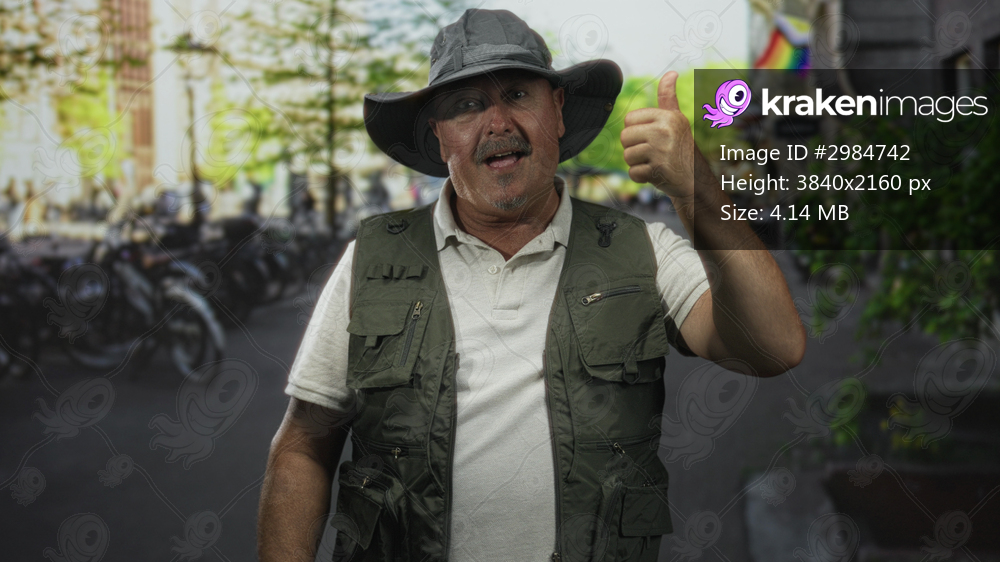 Man in fishing vest gives thumbs up showing bare hand on urban street with parked bicycles and tree lined sidewalk; optimism.