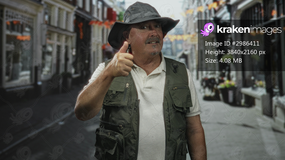 Man in fishing vest and wide brim hat gives thumbs up while standing on a narrow cobblestone street lined with shopfronts and flower displays; travel memory contentment. - Kraken Images