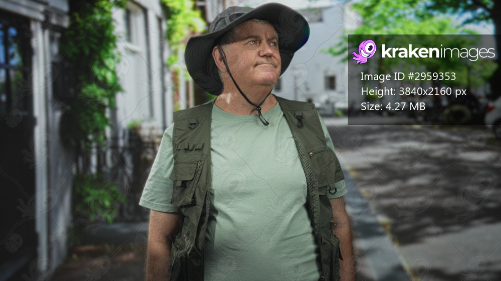 Man in fishing vest and wide brim hat looks upward on a tree lined street, face sunlit and wearing light green shirt; serenity.