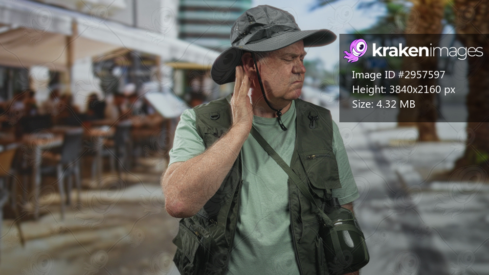 Man in fishing vest and wide hat, hand to cheek while grimacing and closing eyes on a palm lined street beside outdoor cafe; discomfort.