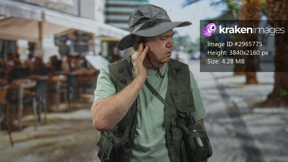 Man in fishing vest and wide hat, hand to cheek while grimacing and closing eyes on a palm lined street beside outdoor cafe; discomfort.