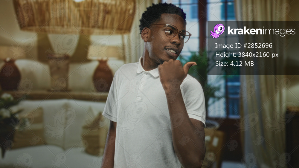 Man in glasses points thumb over shoulder in building lounge near sofa and lamp; confidence greeting.