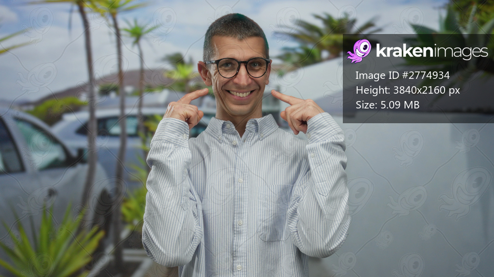 Man in glasses and striped shirt smiles while pointing at his face on a sunny street with palm trees and parked cars in the background.