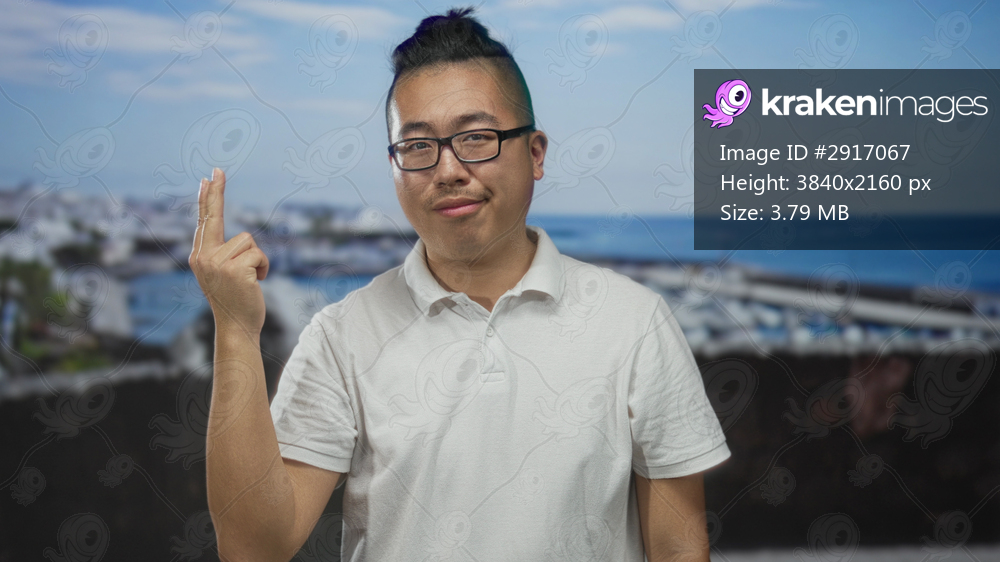 Man in glasses and white polo shirt finger pointing to head in studio with a seaside harbor backdrop; casual confidence.
