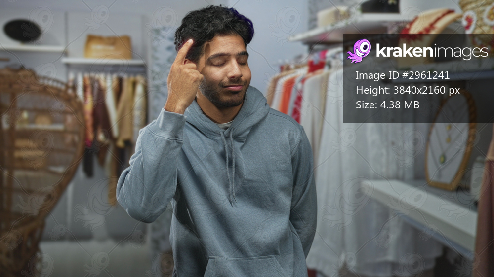 Man in gray hoodie stands among clothing racks and jewelry display, face visible while shrugging and pointing to temple in a retail building; indecision shopping. - Kraken Images