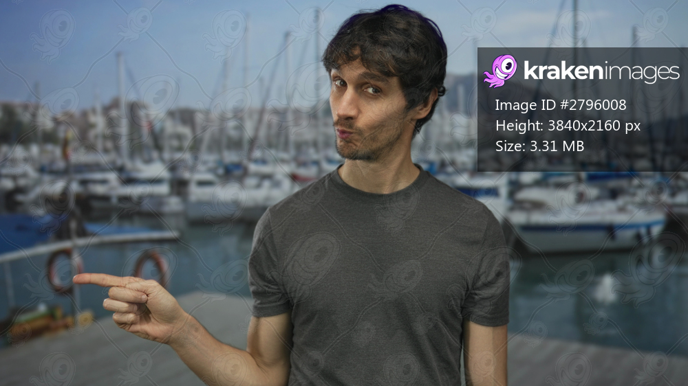 Man in gray shirt pointing finger at boats outside a modern building under a sunny sky on a clear afternoon; curiosity.