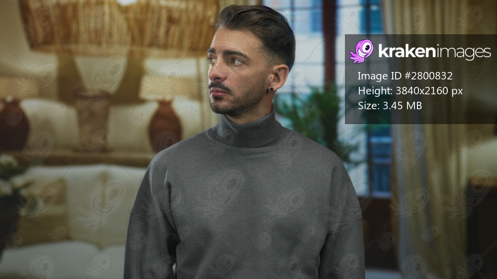 Man in gray sweater turns head to side in building living room near lamp and potted plant by window; quiet reflection.