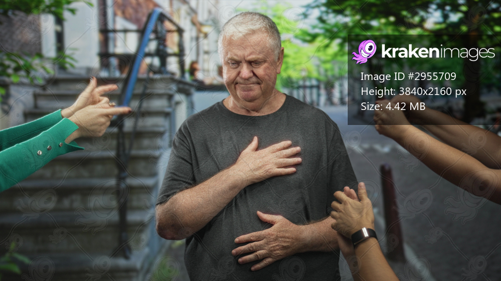 Man in gray t shirt with hand on chest and multiple hands clapping and touching him on a city street; melancholy acceptance.