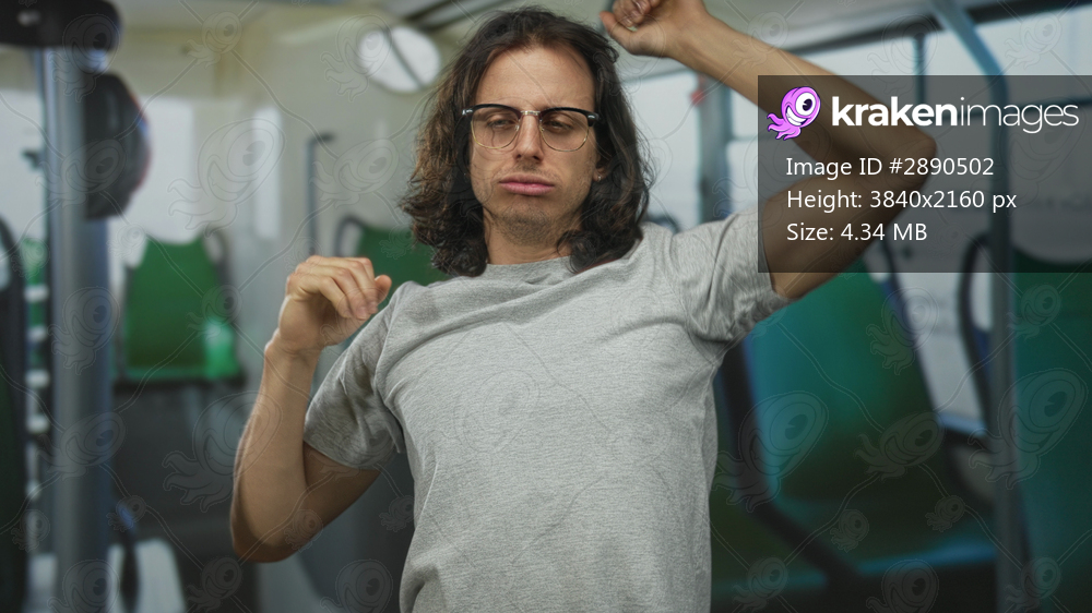 Man in gray tshirt stretching arm and rubbing neck inside a bus with green seats and window street view; commuter fatigue.