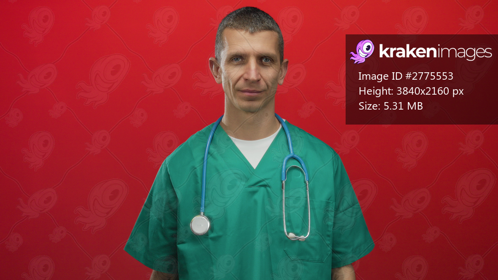 Man in green doctor uniform extends hand with stethoscope over red background, displaying a welcoming gesture.