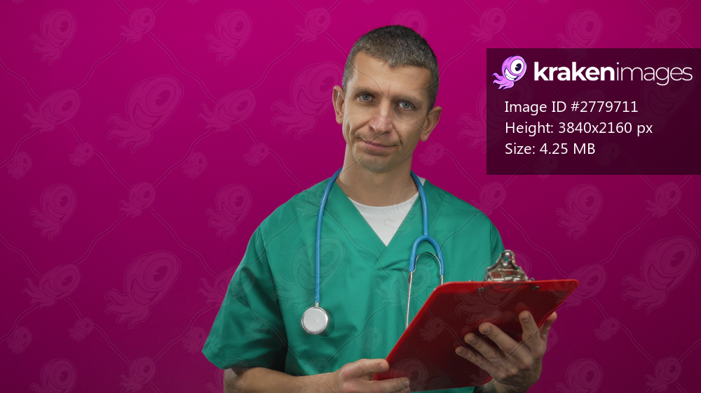 Man in green medical uniform with stethoscope reviewing clipboard against pink background, isolated and professional scene portraying modern healthcare. - Kraken Images