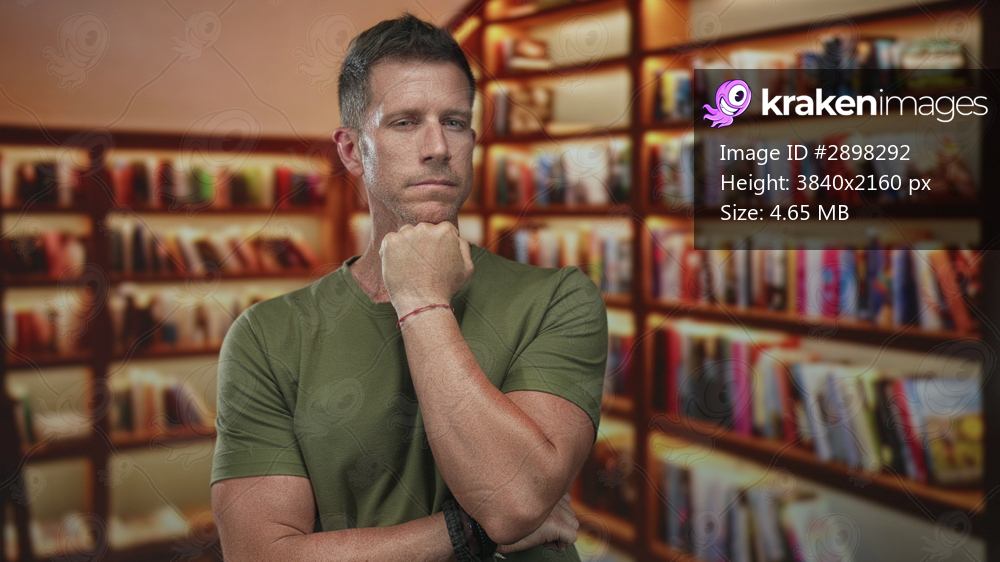 Man in green t shirt with hand on chin and folded arm by bookshelves in library building; pensive reflection.