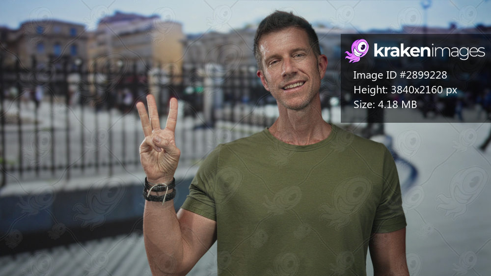 Man in green t shirt holds up three fingers with bracelets on wrist on street near iron fence; counting three cheerful.