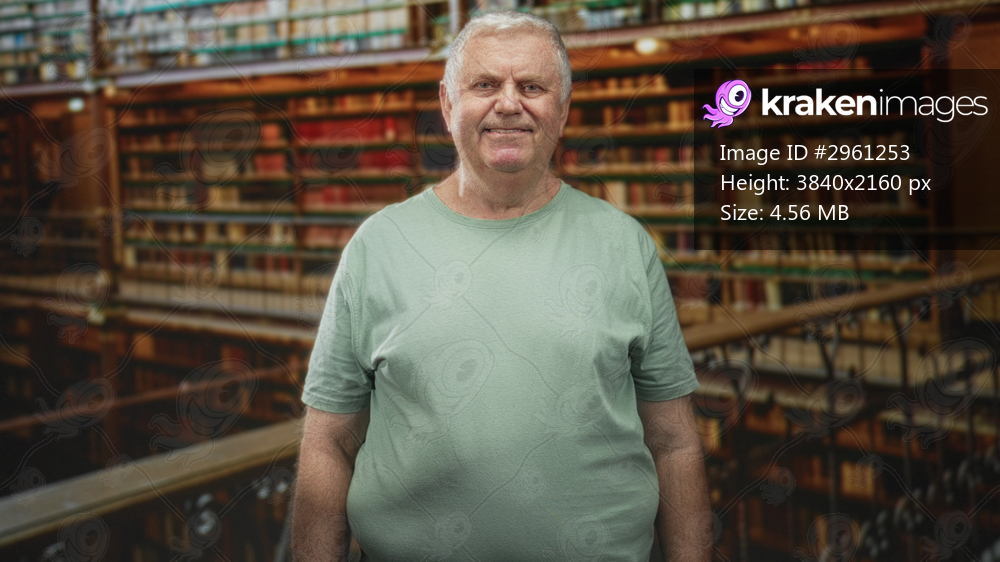 Man in green t shirt smiling with eyes closed and bare forearms visible, standing by bookshelves in a library building; quiet contentment.