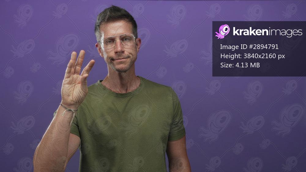 Man in green tshirt wearing glasses pinching fingers with right hand in purple studio setting; skeptical precision.
