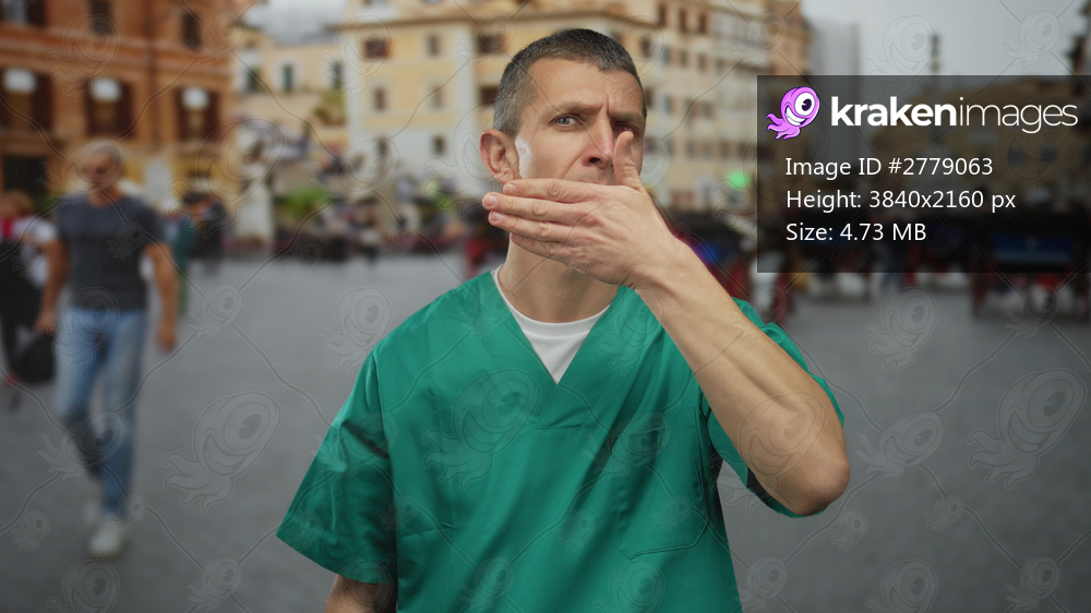 Man in green uniform covering face on a bustling street with blurred people in european cityscape background