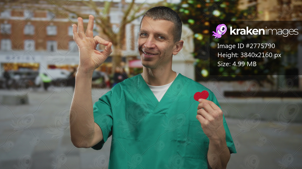 Man in green uniform holds red paper heart and makes ok gesture, standing on a bustling street in front of a christmas-lit backdrop, conveying warmth and professionalism. - Kraken Images