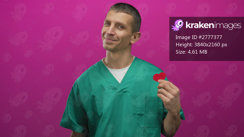 Man in green uniform makes ok gesture holding red heart against a vibrant pink background, showcasing a cheerful medical professional with warmth and confidence. - Kraken Images