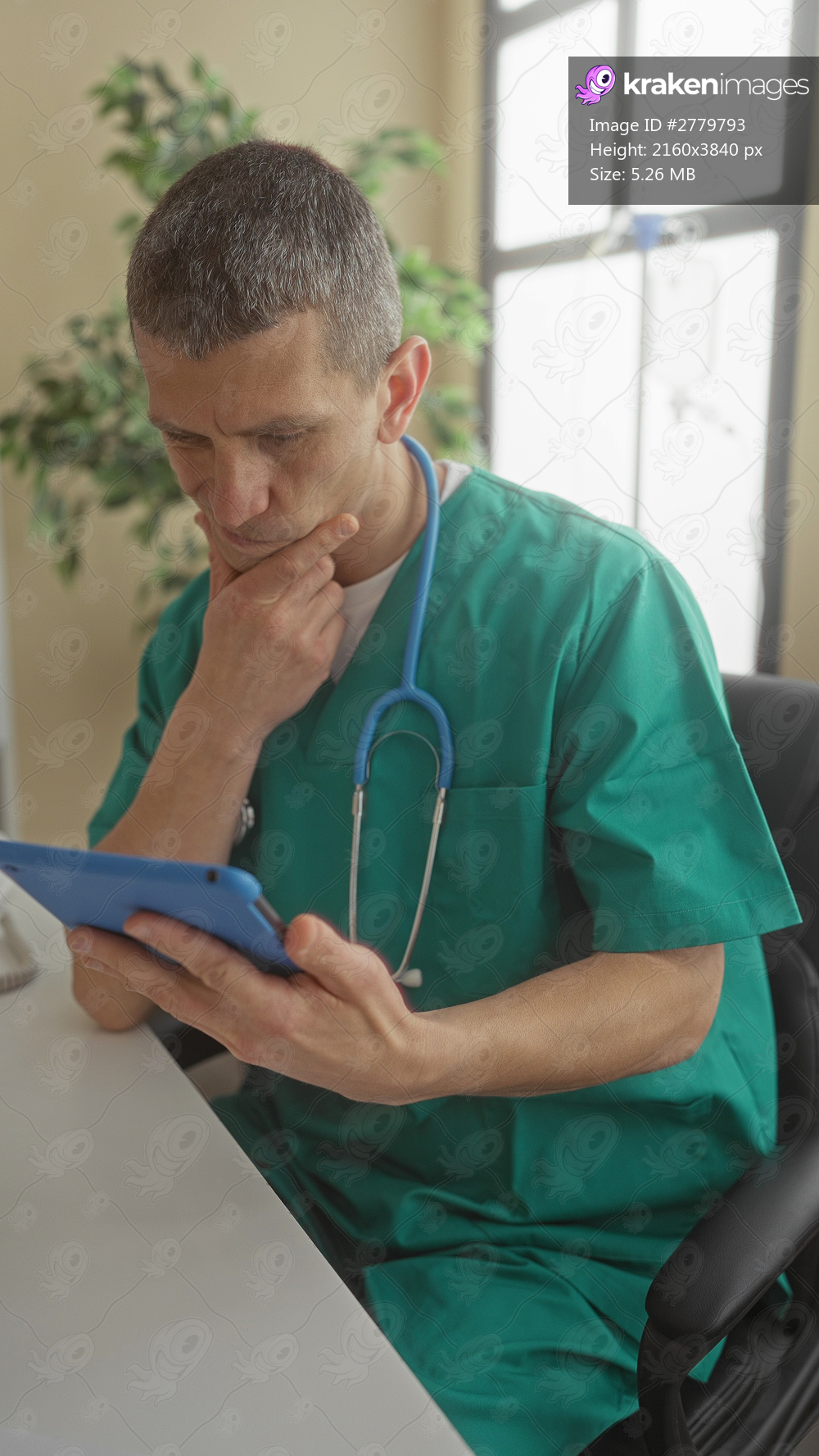 Man in green uniform and stethoscope using tablet thoughtfully in a clinic office, highlighting a healthcare professional in a medical indoor environment. - Kraken Images