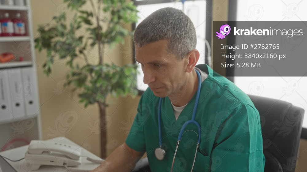 Man in green uniform with stethoscope working on laptop in hospital room, surrounded by medical files and equipment, focused on task in clinical setting. - Kraken Images