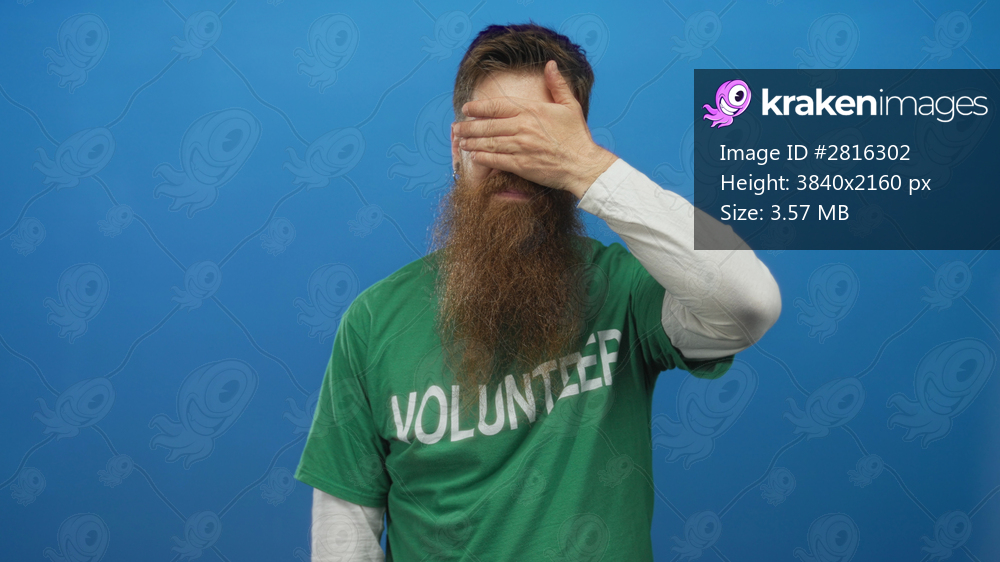 Man in green volunteer shirt covers eyes with hand against blue studio wall; uncertainty reflection.