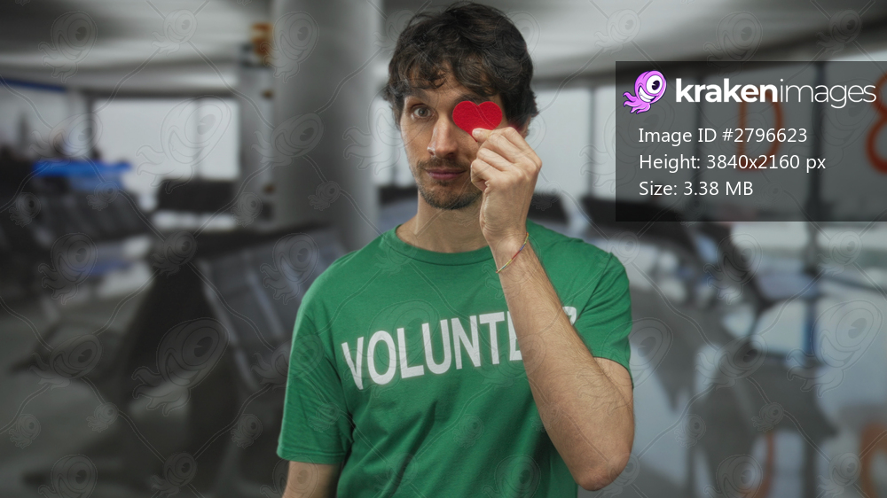 Man in green volunteer shirt holds red heart to eye in busy airport terminal seating area; compassion empathy kindness care.