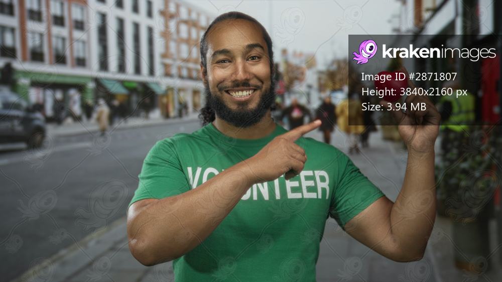 Man in green volunteer shirt points finger to red heart held between fingers on street; kindness community charity.