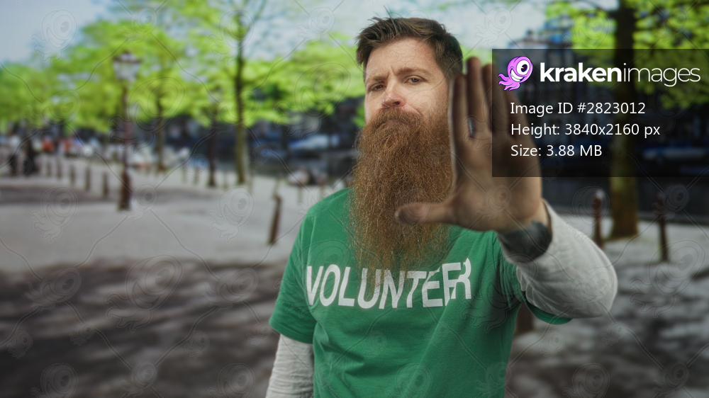 Man in green volunteer shirt raising hand palm outward on a busy city street near canal and trees; determination.