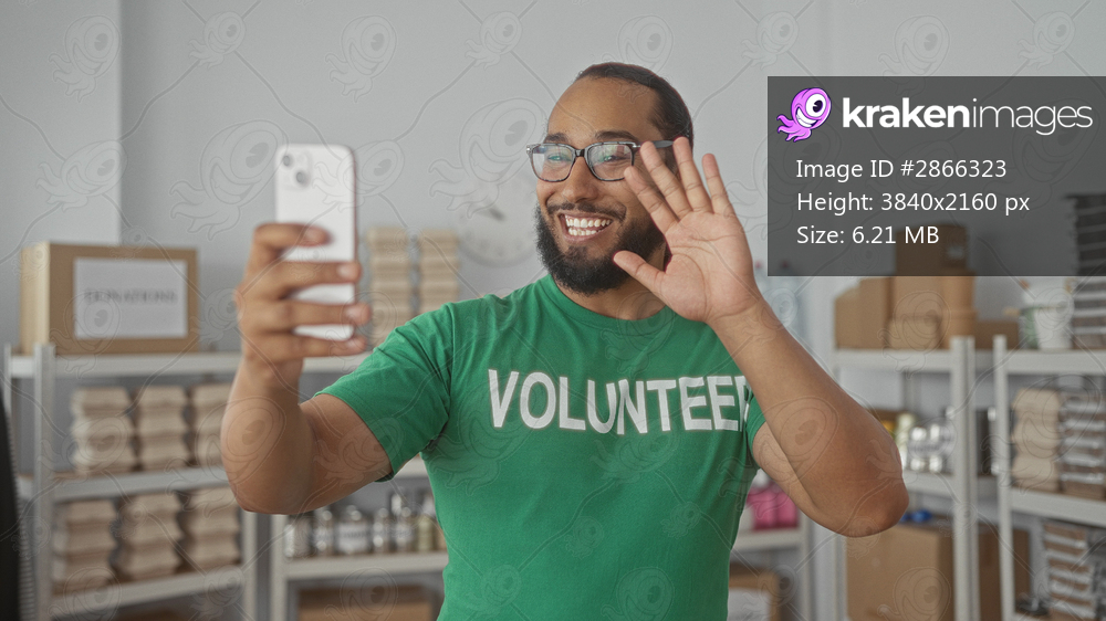 Man in green volunteer shirt smiling and holding a smartphone while giving thumbs up in a donations center building, surrounded by shelves and boxes; community support hope. - Kraken Images