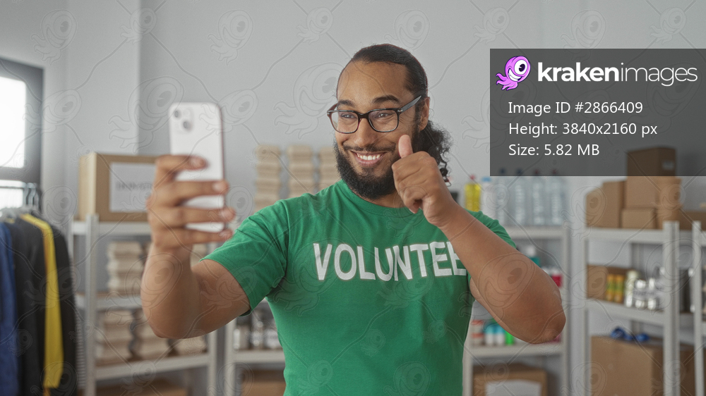 Man in green volunteer shirt smiling and holding a smartphone while giving thumbs up in a donations center building, surrounded by shelves and boxes; community support hope. - Kraken Images
