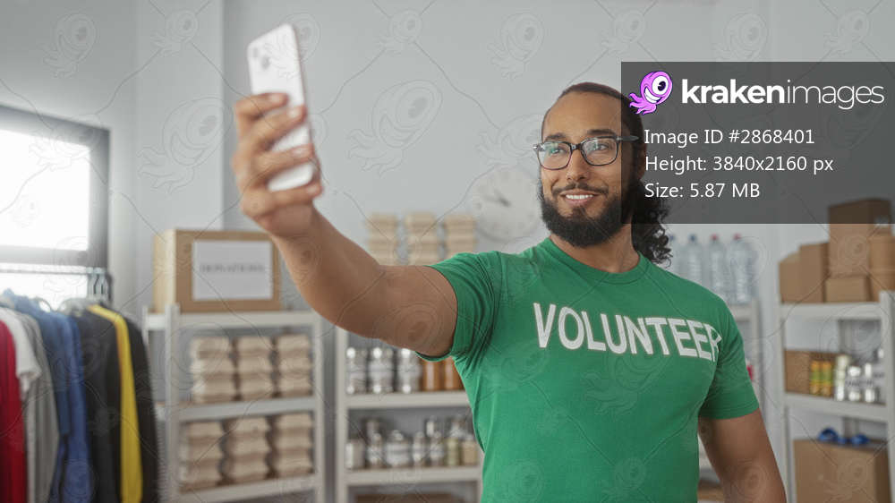 Man in green volunteer shirt taking a selfie while pointing thumb to chest among packed shelves and donation boxes in building; community pride.