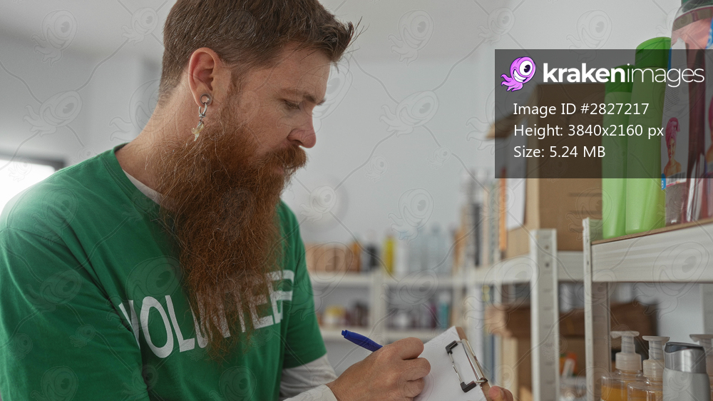 Man in green volunteer shirt writing on clipboard with hand by glass bottles on shelf in building; altruism.