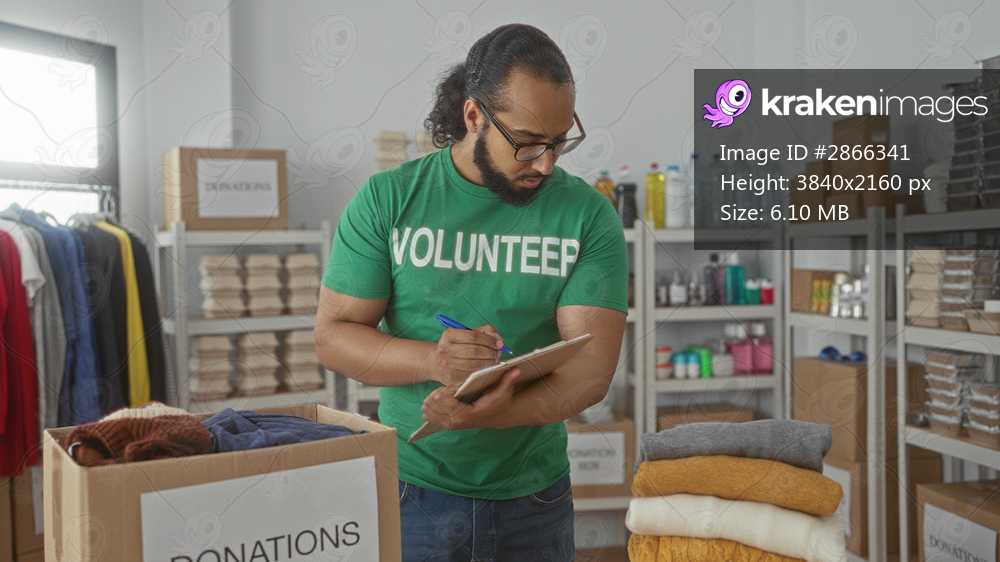 Man in green volunteer shirt writing on clipboard and holding pen inside donation center building, folded clothes and boxes nearby; community service compassion. - Kraken Images
