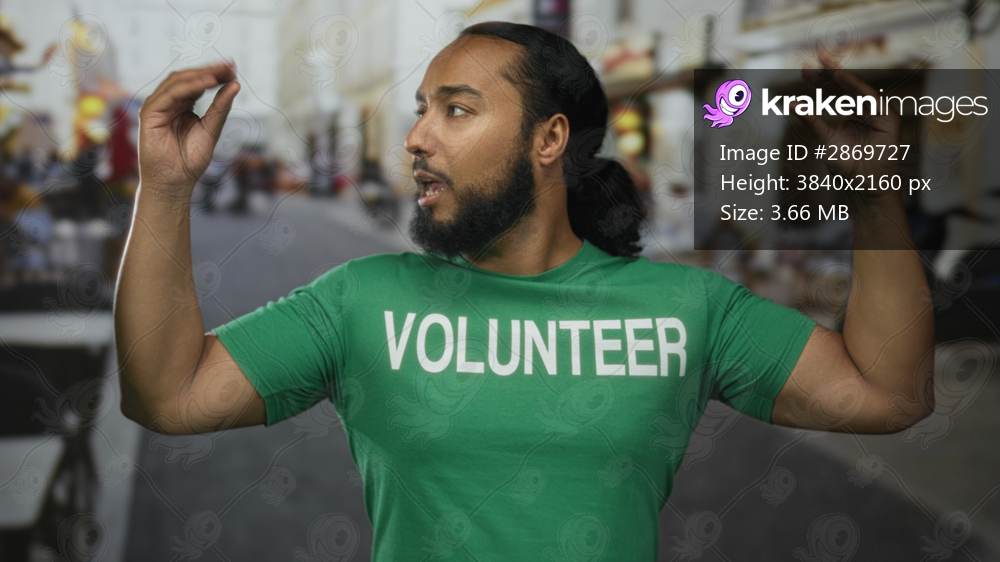 Man in green volunteer tshirt raises both hands in a speaking gesture on a busy city street with blurred market stalls; community service hopeful.