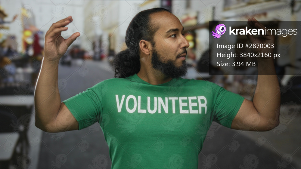 Man in green volunteer tshirt raises both hands in a speaking gesture on a busy city street with blurred market stalls; community service hopeful.
