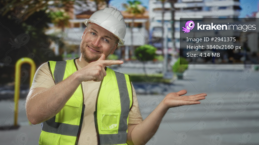 Man in hardhat and high visibility vest, engineer, points finger to temple and shows open palm on street; confidence safety.